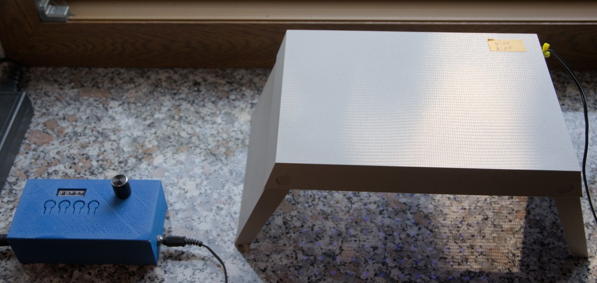 - Zum Anwärmen des Entwicklers dient die nebenstehend abgebildete Heizplatte. Betrieben mit 5V ergibt sich eine Heizleistung von ~25W. Die Schale mit der Entwicklerflüssigkeit wird da daraufgestellt. Die untere Schale (Ferrero Rocher Verpackung, der Inhalt wurde bestimmungsgemäß verwendet. 😁) dient lediglich der leichteren Handhabung.