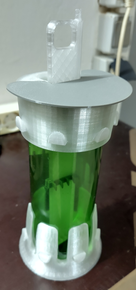 Belüfter. Wird nicht mehr verwendet. Der löst sich bald in der Säure auf.- Behälter. Zurechtgeschnittene Pago-, oder Vöslauer-Flasche 0,75l.